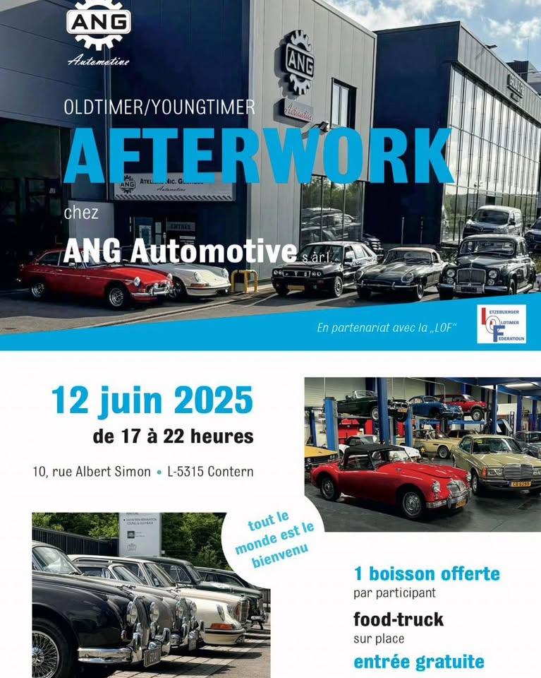 Afterwork fir Oldtimer a Youngtimer bei ANG zu Contern (10, rue Albert Simon) 1 Gedrénks offréiert fir all Participant. E Foodtruck ass op der Plaz. Gratis Entrée - ouni Umeldung